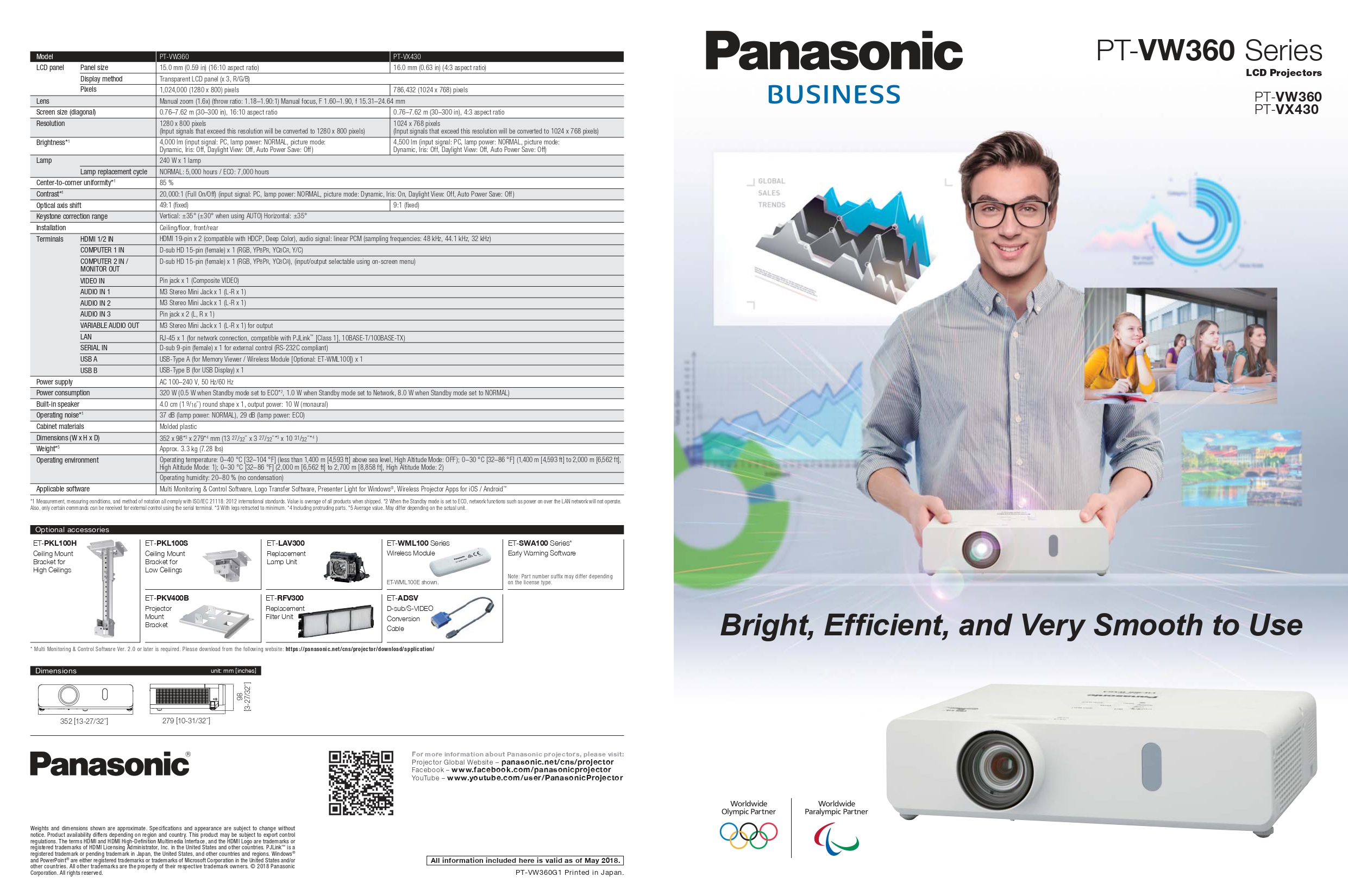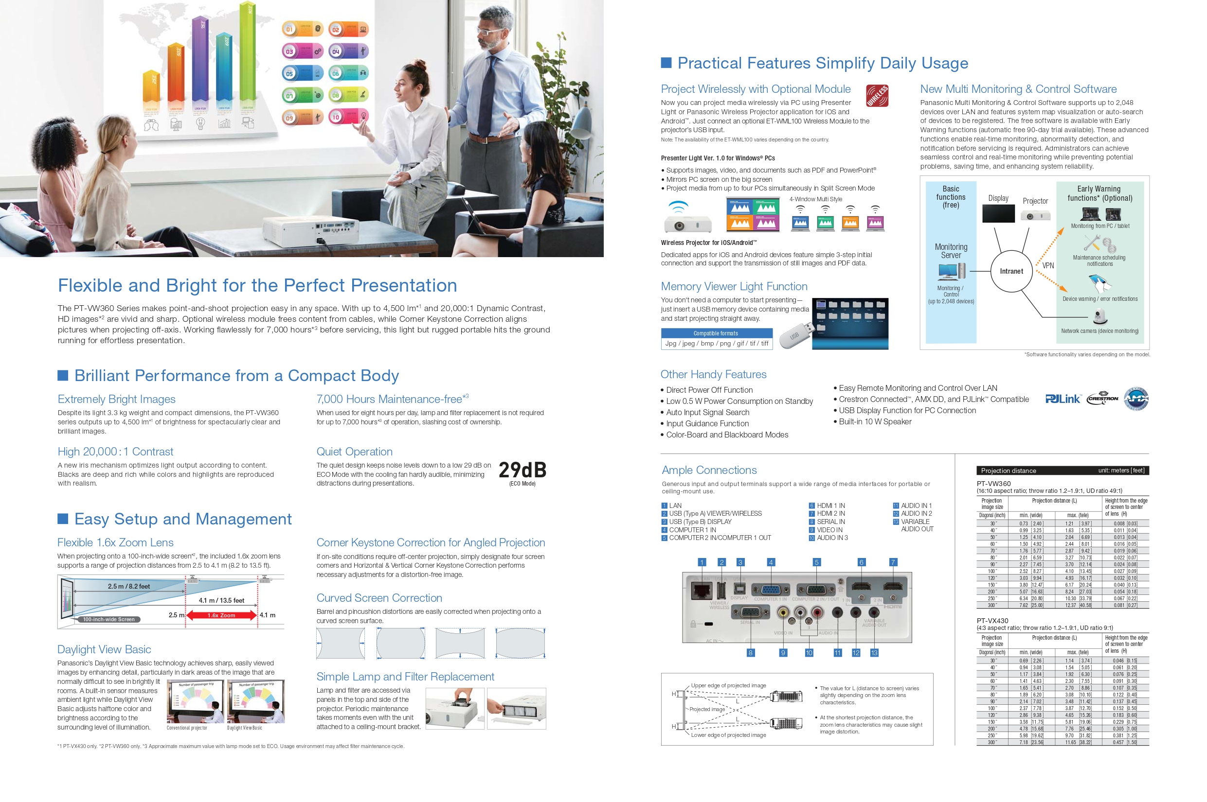 Brilliant Performance from a Compact BodyExtremely Bright ImagesDespite its light 3.3 kg weight and compact dimensions, the PT-VW360 series outputs up to 4,500 lm* of brightness for spectacularly clear and brilliant images. High 20,000:1 ContrastA new iris mechanism optimizes light output according to content. Blacks are deep and rich while colors and highlights are reproduced with realism. 7,000 Hours Maintenance-free*When used for eight hours per day, lamp and filter replacement is not required for up to 7,000 hours* of operation, slashing cost of ownership. Quiet OperationThe quiet design keeps noise levels down to a low 29 dB on ECO Mode with the cooling fan hardly audible, minimizing distractions during presentations. ![]() Easy Setup and ManagementFlexible 1.6x Zoom LensWhen projecting onto a 100-inch-wide screen*, the included 1.6x zoom lens supports a range of projection distances from 2.5 to 4.1 m (8.2 to 13.5 ft). ![]() Daylight View BasicPanasonic’s Daylight View Basic technology achieves sharp, easily viewed images by enhancing detail, particularly in dark areas of the image that are normally difficult to see in brightly lit rooms. A built-in sensor measures ambient light while Daylight View Basic adjusts halftone color and brightness according to the surrounding level of illumination. ![]() Corner Keystone Correction for Angled ProjectionIf on-site conditions require off-center projection, simply designate four screen corners and Horizontal & Vertical Corner Keystone Correction performs necessary adjustments for a distortion-free image. Curved Screen CorrectionBarrel and pincushion distortions are easily corrected when projecting onto a curved screen surface. ![]() Simple Lamp and Filter ReplacementLamp and filter are accessed via panels in the top and side of the projector. Periodic maintenance takes moments even with the unit attached to a ceiling-mount bracket. ![]() Practical Features Simplify Daily UsageProject Wirelessly with Optional ModuleNow you can project media wirelessly via PC using Presenter Light or Panasonic Wireless Projector application for iOS and Android™. Just connect an optional ET-WML100 Wireless Module to the projector’s USB input. Note: The availability of the ET-WML100 varies depending on the country. Presenter Light Ver. 1.0 for Windows® PCs